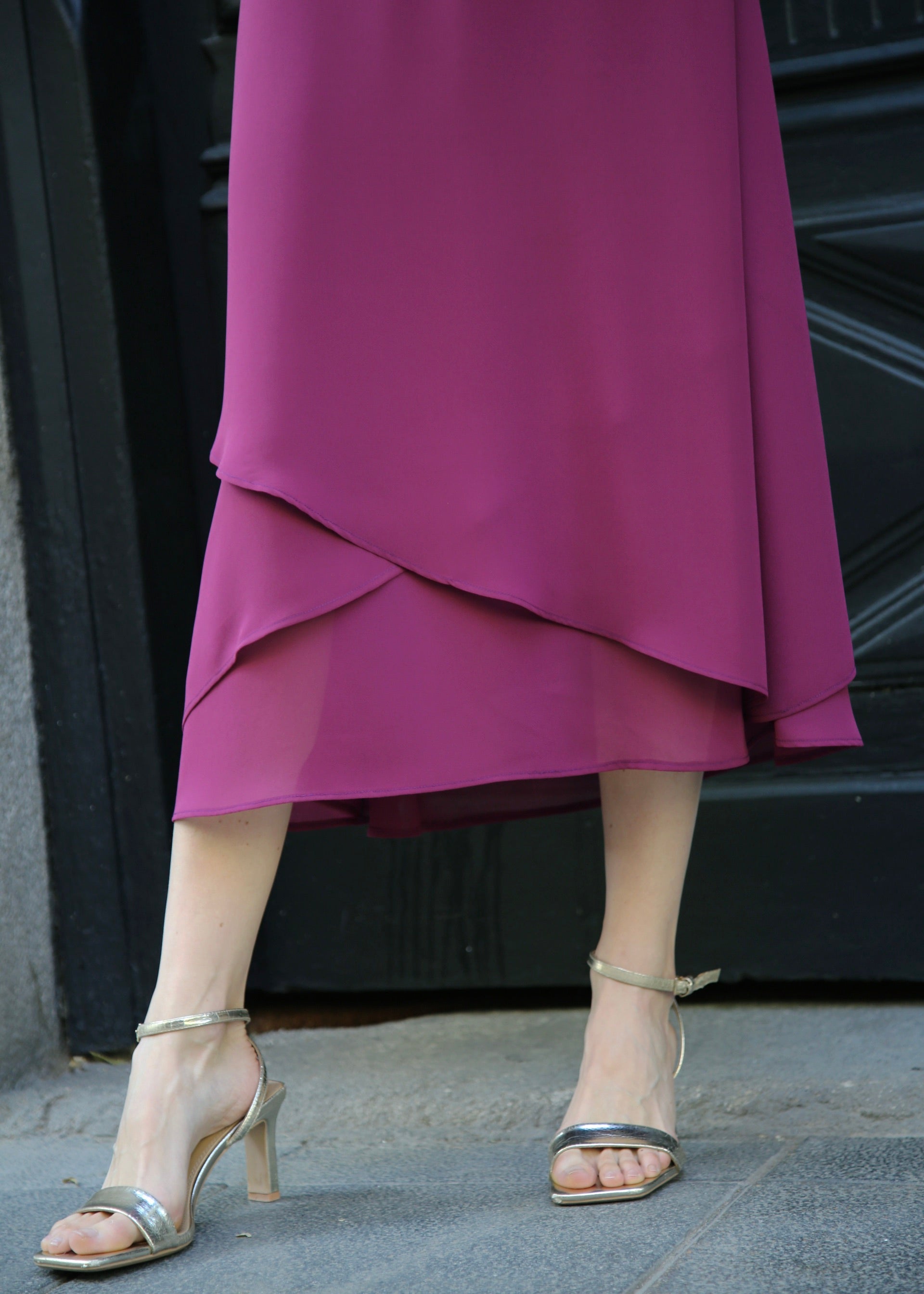 La falda Erika destaca por sus tres capas jugando con las transparencias, cada una con un bajo asimétrico que añade movimiento y gracia.